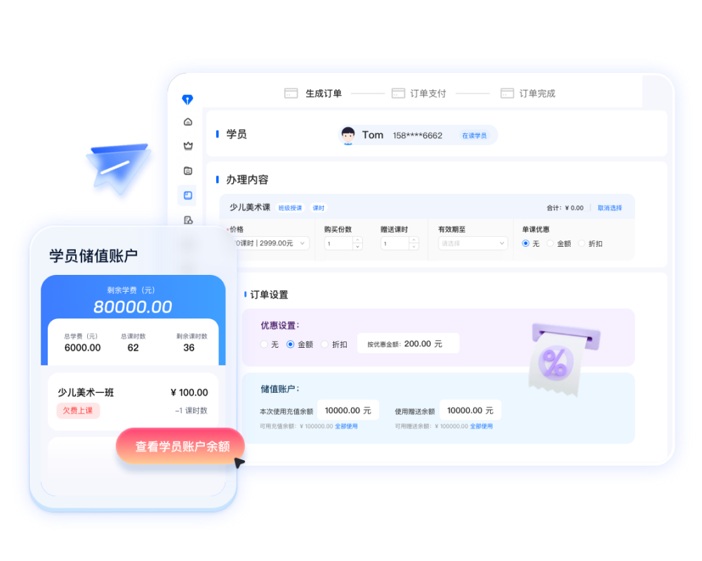支持现付,或选择学员储值账户扣除学费金额;同时支持欠费报名,学员先上课后缴费