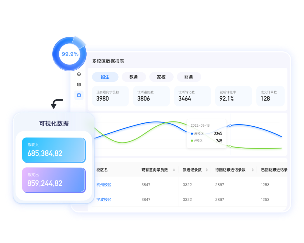 总校数据监控看板,监控分校招生、教务、财务等核心数据